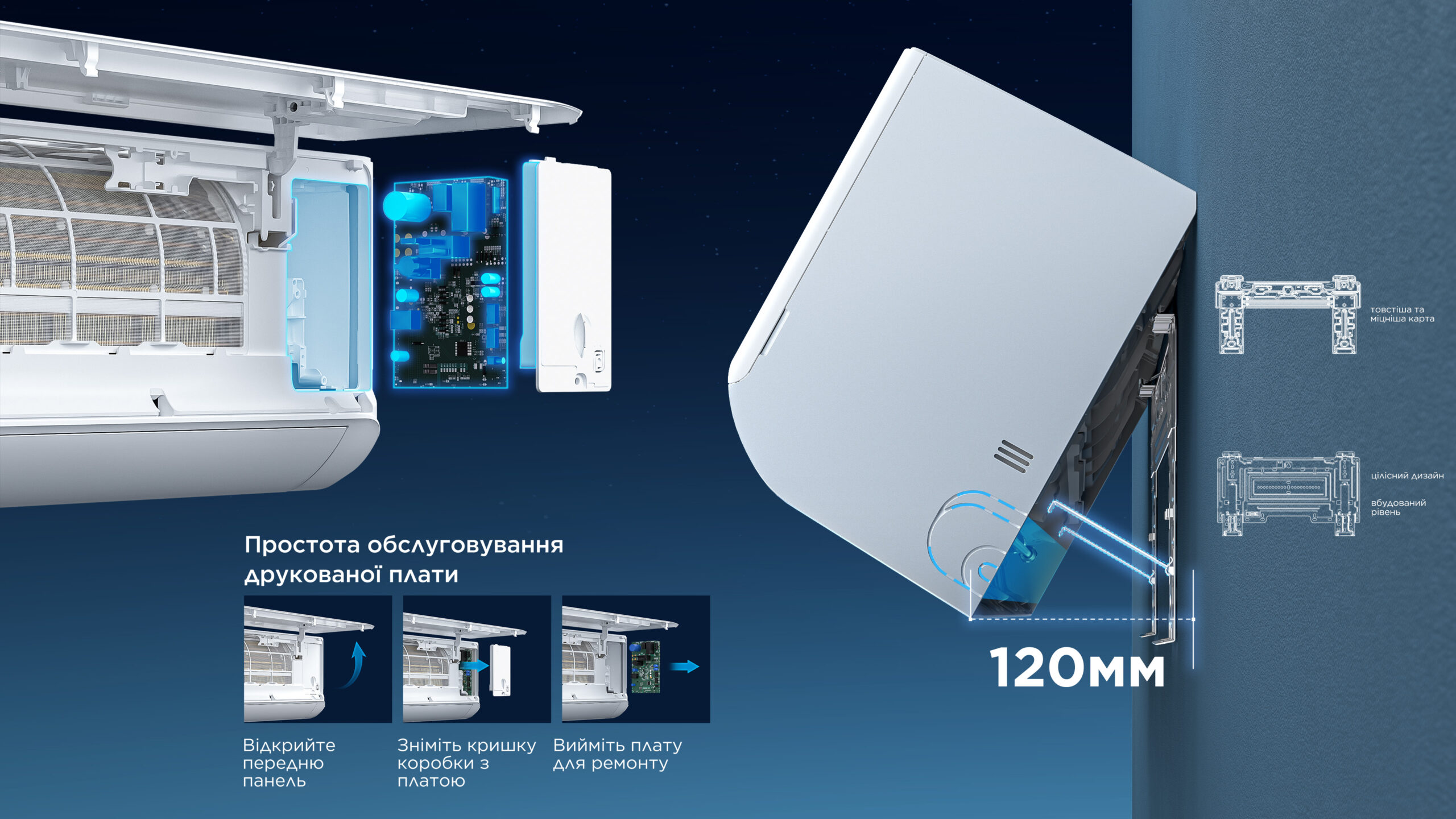 Продумана конструкція внутрішнього блоку, яка забезпечує простоту та зручність у користуванні й обслуговуванні. Завдяки оптимізованій конструкції монтаж виконується швидко та без зайвих зусиль. Друкована плата легко доступна, що спрощує сервісне обслуговування та діагностику.Світлодіодний дисплей
